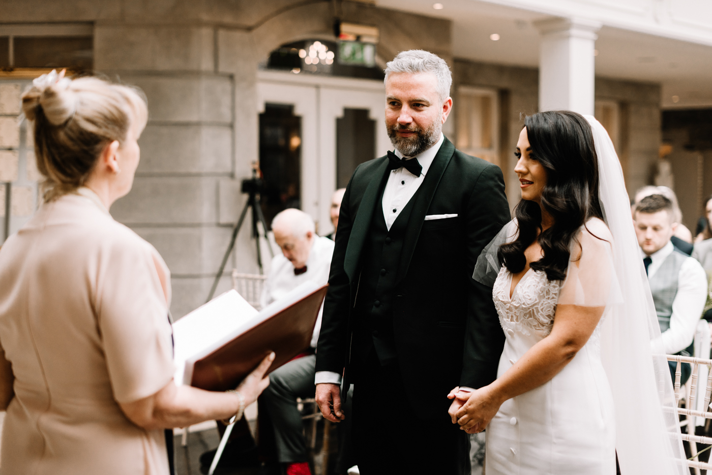 The ceremony took place in the ballroom with the couple’s closest friends and family gathered to witness their union. As the guests took their seats, the sound of traditional Irish music filled the air, adding to the magical atmosphere of the day.
